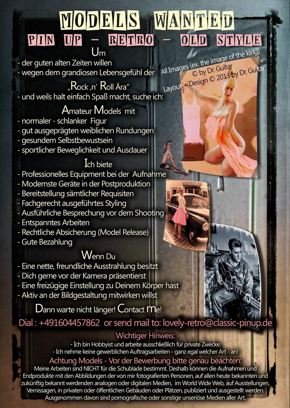 Du hast das PDF Dokument „Stilrichtungen der Poeple Fotografie/Videografie" gelesen? Du hast auf dieser Seite ordentlich rumgestöbert? Vielleicht sogar den Flyer geladen und mal einen Blick auf den Model Vertrag geworfen? Du möchtest vielleicht einen Versuch wagen? Du weißt nicht wirklich was Du gerne für Bilder von Dir hättest? Einfach nur ein auf alt gemachtes Photo mit tollen Klamotten und nem 50er Jahre Schlitten? Oder gar eine Pin Up Illustration? Du hast noch viele Fragen? Du bist Dir sicher!!!??? Egal was auch immer, Du kannst runter-scrollen oder ganz einfach auf den Film klicken, das Formular ausfüllen, auf "SENDEN" klicken - Und los geht's!